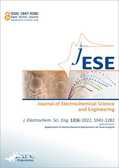 J. Electrochem. Sci. Eng. Vol 12, No 6 was published Special Issue: Application of Electrochemical (Bio)Sensors for Food Analysis Guest editor: Somayeh Tajik FULL ISSUE JESE 12(6) (2022) 1041-1282 Electroanalytical Chemistry Electrochemical strategies for detection of diazinonReview paper Azadeh Lohrasbi‑Nejad J. Electrochem. Sci. Eng., Vol. 12 No. 6 (2022), 1041-1059 Published 17-09-2022; DOI: https://doi.org/10.5599/jese.1379 PDF (722 KB) Electrochemical detection of sulfite in food samplesReview paper Yasser Fakri Mustafa, Gholamabbas Chehardoli, Sepideh Habibzadeh, Zeinab Arzehgar J. Electrochem. Sci. Eng., Vol. 12 No. 6 (2022), 1061-1079 Published 29-11-2022; DOI: https://doi.org/10.5599/jese.1555 PDF (720 KB) An overview of recent advances in the detection of ascorbic acid by electrochemical techniquesReview paper Raed Muslim Mhaibes, Farzaneh Fazeli, Issa Amini, Vahid Azizkhani J. Electrochem. Sci. Eng., Vol. 12 No. 6 (2022), 1081-1098 Published 30-11-2022; DOI: https://doi.org/10.5599/jese.1561 PDF (637 KB) Flower-like MoS2 screen-printed electrode based sensor for the sensitive detection of sunset yellow FCF in food samplesOriginal scientific paper Peyman Mohammadzadeh Jahani J. Electrochem. Sci. Eng., Vol. 12 No. 6 (2022), 1099-1109 Published 23-07-2022; DOI: https://doi.org/10.5599/jese.1413 PDF (687 KB) Electrochemical detection of folic acid using a modified screen printed electrodeOriginal scientific paper Sayed Zia Mohammadi, Farideh Mousazadeh, Maryam Mohammadhasani-Pour J. Electrochem. Sci. Eng., Vol. 12 No. 6 (2022), 1111-1120 Published 27-07-2022; DOI: https://doi.org/10.5599/jese.1360 PDF (804 KB) MnO2 nanorods modified screen-printed electrode for the electrochemical determination of Sudan dye in food sampleOriginal scientific paper Peyman Mohammadzadeh Jahani, Sayed Ali Ahmadi J. Electrochem. Sci. Eng., Vol. 12 No. 6 (2022), 1121-1131 Published 30-07-2022; DOI: https://doi.org/10.5599/jese.1415 PDF (697 KB) A sensitive and simple electrochemical technique for detecting ascorbic acid content in pharmaceutical and biological compoundsOriginal scientific paper Farideh Mousazadeh, Sayed Zia Mohammadi J. Electrochem. Sci. Eng., Vol. 12 No. 6 (2022), 1133-1142 Published 10-08-2022; DOI: https://doi.org/10.5599/jese.1366 PDF (761 KB) A sensitive sensor based on graphitic carbon nitride/1-butyl-3-methylimidazolium hexafluorophosphate ionic liquids modified carbon paste electrode for sensing of carmoisine dye in food samplesOriginal scientific paper Sayed Zia Mohammadi, Farideh Mousazadeh J. Electrochem. Sci. Eng., Vol. 12 No. 6 (2022), 1143-1152 Published 26-08-2022; DOI: https://doi.org/10.5599/jese.1396 PDF (661 KB) Synthesis of vanadium oxide nanoplates for electrochemical detection of amaranth in food samplesOriginal scientific paper Reza Zaeimbashi, Ali Mostafavi, Tayebeh Shamspur J. Electrochem. Sci. Eng., Vol. 12 No. 6 (2022), 1153-1163 Published 06-10-2022; DOI: https://doi.org/10.5599/jese.1394 PDF (1,116 KB) Electrochemical determination of amaranth in food samples by using modified electrodeOriginal scientific paper Sayed Zia Mohammadi, Yar-Mohammad Baghelani, Farideh Mousazadeh, Shamsi Rahimi, Maryam Mohammad-Hassani J. Electrochem. Sci. Eng., Vol. 12 No. 6 (2022), 1165-1177 Published 04-11-2022; DOI: https://doi.org/10.5599/jese.1531 PDF (643 KB) SUPPLEMENTARY MATERIAL (395 KB) Determination of kojic acid using carbon paste electrode modified by [Fe(HL)2Cl2] nano-complex and ionic liquidOriginal scientific paper Mahbubeh Fazli, Niloufar Akbarzadeh-T J. Electrochem. Sci. Eng., Vol. 12 No. 6 (2022), 1179-1192 Published 28-11-2022; DOI: https://doi.org/10.5599/jese.1486 PDF (875 KB) An electrochemical sensor for detection of vanillin in food samples using CuFe2O4 nanoparticles/ionic liquids modified carbon paste electrodeOriginal scientific paper Afsaneh Hajializadeh J. Electrochem. Sci. Eng., Vol. 12 No. 6 (2022), 1193-1203 Published 08-09-2022; DOI: https://doi.org/10.5599/jese.1395 PDF (785 KB) Fe3O4/GO nanocomposite modified glassy carbon electrode as a novel voltammetric sensor for determination of bisphenol AOriginal scientific paper Fariba Beigmoradi, Hadi Beitollahi J. Electrochem. Sci. Eng., Vol. 12 No. 6 (2022), 1205-1214 Published 14-09-2022; DOI: https://doi.org/10.5599/jese.1482 PDF (669 KB) Voltammetric folic acid sensor based on nickel ferrite nanoparticles modified-screen printed graphite electrodeOriginal scientific paper Peyman Mohammadzadeh Jahani, Mohammad Reza Aflatoonian J. Electrochem. Sci. Eng., Vol. 12 No. 6 (2022), 1215-1224 Published 30-11-2022; DOI: https://doi.org/10.5599/jese.1607 PDF (655 KB) Electrochemical Science Screen-printed carbon electrode/natural silica-ceria nanocomposite for electrochemical aptasensor applicationOriginal scientific paper Salma Nur Zakiyyah, Diana Rakhmawaty Eddy, M. Lutfi Firdaus, Toto Subroto, Yeni Wahyuni Hartati J. Electrochem. Sci. Eng., Vol. 12 No. 6 (2022), 1225-1242 Published 06-10-2022; DOI: https://doi.org/10.5599/jese.1455 PDF (1,010 KB) Theoretical and electrochemical analysis of L-serine modified graphite paste electrode for dopamine sensing applications in real samplesOriginal scientific paper Revanappa Santhosh Kumar, Gururaj Kudur Jayaprakash, Siddalinganahalli Manjappa, Mohan Kumar, Avvaru Praveen Kumar J. Electrochem. Sci. Eng., Vol. 12 No. 6 (2022), 1243-1250 Published 04-07-2022; DOI: https://doi.org/10.5599/jese.1390 PDF (668 KB) A WSe2@poly(3,4-ethylenedioxythiophene) nanocomposite-based electrochemical sensor for simultaneous detection of dopamine and uric acidOriginal scientific paper Yasin Tangal, Deniz Coban, Sadik Cogal J. Electrochem. Sci. Eng., Vol. 12 No. 6 (2022), 1251-1259 Published 25-07-2022; DOI: https://doi.org/10.5599/jese.1375 PDF (1,097 KB) Coatings Duplex electroless Ni-P/Ni-Cu-P coatings: Preparation, evaluation of microhardness, friction, wear, and corrosion performanceTechnical report Palash Biswas, Suman Kalyan Das, Prasanta Sahoo J. Electrochem. Sci. Eng., Vol.