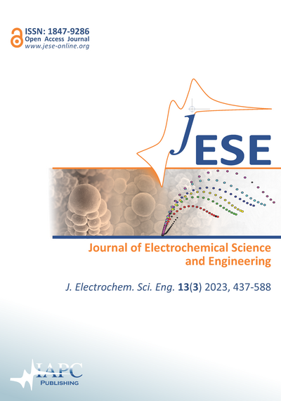 J. Electrochem. Sci. Eng. Vol 13, No 3 was published FULL ISSUE JESE 13(3) (2023) 437-588 Electroanalytical Chemistry Some progress in voltammetric methods to detect malachite green in real samples using carbon electrodesReview paper Madhusudan Dasnur Nanjappa, Gururaj Kudur Jayaprakash J. Electrochem. Sci. Eng., Vol. 13 No. 3 (2023), 437-449 Published 02-06-2023; DOI: https://doi.org/10.5599/jese.1480 PDF (453 KB) Corrosion Effect of KOH concentration on corrosion behavior and surface morphology of stainless steel 316L for HHO generator applicationOriginal scientific paper Basori Basori, Wan M. F. W. Mohamad, Muhd R. Mansor, Noreffendy Tamaldin, Agung Iswandi, Maman K. Ajiriyanto, Ferry Budhi Susetyo J. Electrochem. Sci. Eng., Vol. 13 No. 3 (2023), 451-467 Published 19-03-2023; DOI: https://doi.org/10.5599/jese.1615 PDF (1,260 KB) Optimization of the inhibition corrosion of carbon steel in an acidic medium by a novel eco-friendly inhibitor Asphodelus ramosus using response surface methodologyOriginal scientific paper Narimane Saigaa, Sabrina Bouguessa, Wafia Boukhedena, Mohammed Nacer, Ayoub Nadji, Abdelkarim Gouasmia J. Electrochem. Sci. Eng., Vol. 13 No. 3 (2023), 469-490 Published 14-03-2023; DOI: https://doi.org/10.5599/jese.1628 PDF (1,273 KB) Bioelectrochemistry Self-assembling nanomaterial-based peptide surface for target cell adhesionOriginal scientific paper Hasret Turkmen J. Electrochem. Sci. Eng., Vol. 13 No. 3 (2023), 491-504 Published 18-04-2023; DOI: https://doi.org/10.5599/jese.1664 PDF (913 KB) Batteries And Supercapcitors Modeling the velocity profiles in vanadium redox flow batteries-serpentine flow fieldOriginal scientific paper Sarede Yadav, Balaji Krishnamurthy J. Electrochem. Sci. Eng., Vol. 13 No. 3 (2023), 505-519 Published 17-03-2023; DOI: https://doi.org/10.5599/jese.1610 PDF (2,084 KB) Gama-Fe2O3 silica-coated 2-(2-benzothiazolyl azo)-4-methoxyaniline for supercapacitive performanceOriginal scientific paper Jinan Mohammed Mahmood , Zaid H. Mahmoud , Noor Sabah Al-Obaidi , Ahmed M Rahima J. Electrochem. Sci. Eng., Vol. 13 No. 3 (2023), 521-536 Published 06-02-2023; DOI: https://doi.org/10.5599/jese.1657 PDF (1,126 KB) Electrochemical Engineering Phenol removal by electro-Fenton process using a 3D electrode with iron foam as particles and carbon fibre modified with grapheneOriginal scientific paper Hind H. Thwaini, Rasha H. Salman J. Electrochem. Sci. Eng., Vol. 13 No. 3 (2023), 537-551 Published 21-06-2023; DOI: https://doi.org/10.5599/jese.1806 PDF (1,242 KB) Performance of magnetized tool in electrochemical micromachining on scrapped alloy wheel matrix compositeOriginal scientific paper Venugopal Palaniswamy, Thanigaivelan Rajasekaran J. Electrochem. Sci. Eng., Vol. 13 No. 3 (2023), 553-561 Published 13-03-2023; DOI: https://doi.org/10.5599/jese.1660 PDF (884 KB) Electrochemical obtaining of rhenium-molybdenum alloysOriginal scientific paper Elza Salakhova, Dilgam Tagiyev, Parvana Kalantarova, Kamala Ibrahimova, Yilmaz Alizada, Ramila Huseynova, Irana Cabbarova J. Electrochem. Sci. Eng., Vol. 13 No. 3 (2023), 563-573 Published 27-06-2023; DOI: https://doi.org/10.5599/jese.1696 PDF (593 KB) One-pot synthesis of crystalline structure: Nickel-iron phosphide and selenide for hydrogen production in alkaline water splittingOriginal scientific paper Mukhtiar Ahmed, Abdul Hanan, Muhammad Nazim Lakhan , Altaf Hussain Shar , Irfan Ali Soomro, Binguang Niu, Yang Yang J. Electrochem. Sci. Eng., Vol. 13 No. 3 (2023), 575-588 Published 27-06-2023; DOI: https://doi.org/10.5599/jese.1721 PDF (1,211 KB) Read more …
