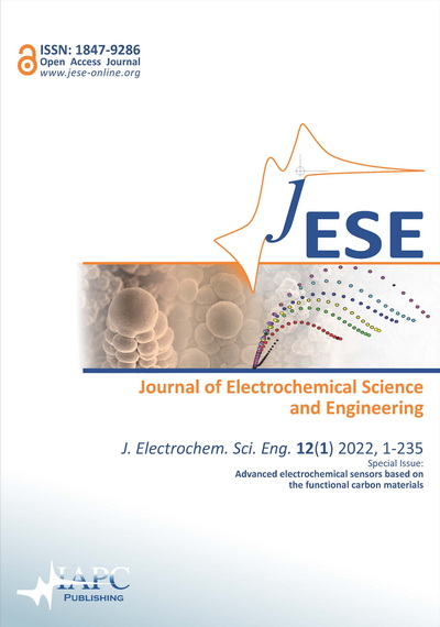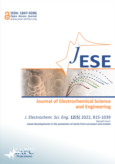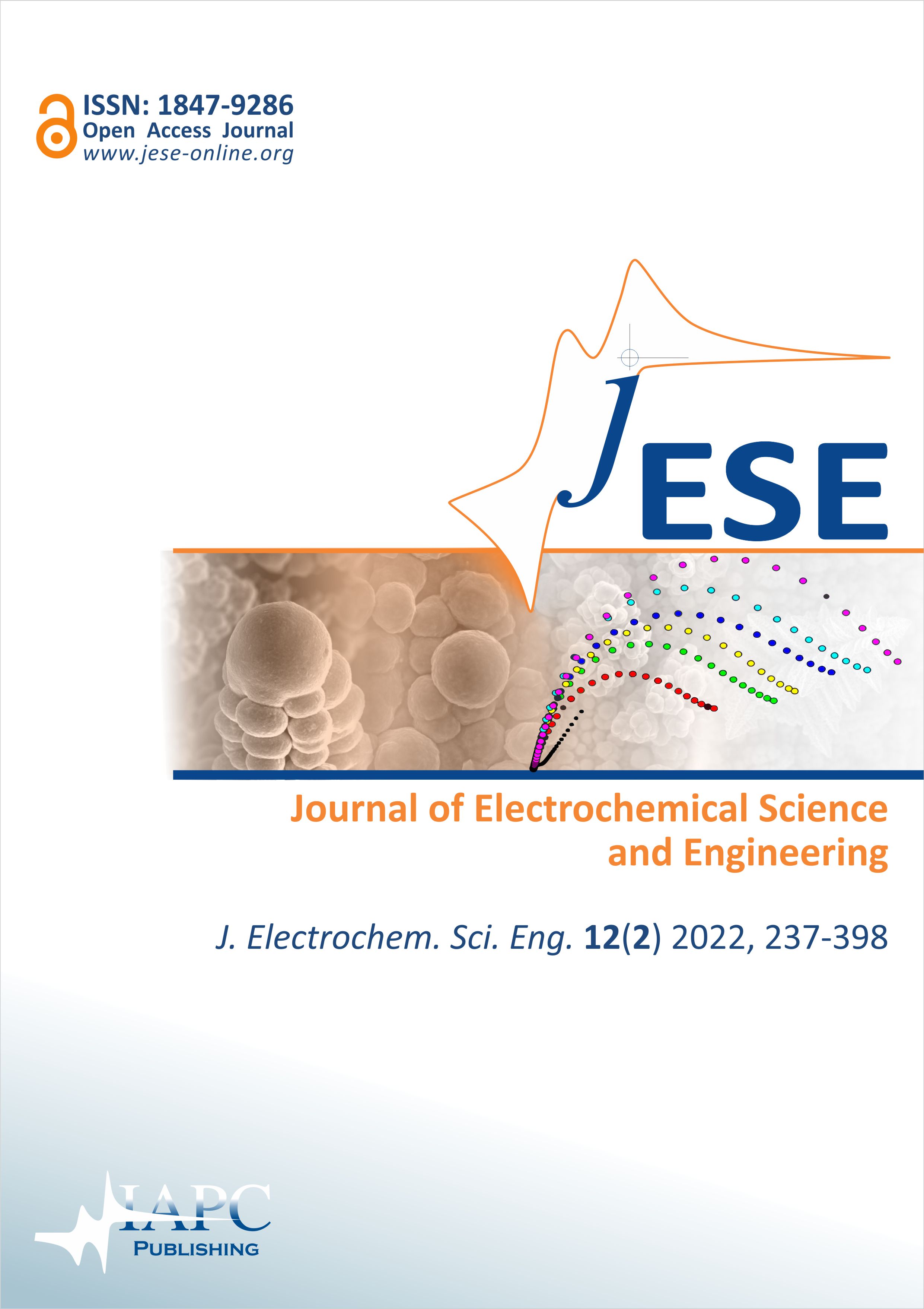 J. Electrochem. Sci. Eng. Vol 12, No 2 was published Electrochemical Science A review of the electrochemical corrosion of metals in choline chloride based deep eutectic solvents Mihael Bučko, Jelena Bajat J. Electrochem. Sci. Eng., Vol. 12 No. 2 (2022), 237-252 Published 13-11-2021; DOI: https://doi.org/10.5599/jese.1135 PDF (836 KB) Influence of supporting electrolyte on electrochemical formation of copper nanoparticles and their electrocatalytic properties Noelia Zurita, Silvana García J. Electrochem. Sci. Eng., Vol. 12 No. 2 (2022), 253-264 Published 22-11-2021; DOI: https://doi.org/10.5599/jese.1077 PDF (1,082 KB) Electrochemical studies of lateral flow assay test results for procalcitonin detection Yachana Gupta, Kalpana, Aditya Sharma Ghrera J. Electrochem. Sci. Eng., Vol. 12 No. 2 (2022), 265-274 Published 28-11-2021; DOI: https://doi.org/10.5599/jese.1127 PDF (776 KB) Electrodeposited palladium as efficient electrocatalyst for hydrazine and methanol electro-oxidation and detection Jelena D. Lović J. Electrochem. Sci. Eng., Vol. 12 No. 2 (2022), 275-282 Published 17-12-2021; DOI: https://doi.org/10.5599/jese.1166 PDF (557 KB) Electrosynthesis of gold nanocomposites based on a copolymer of 1-vinyl-1,2,4-triazol with crotonic acid Serzhik H. Sargsyan, Artur S. Sargsyan, Tatevik S. Sargsyan, Karina M. Khizantsyan, Ida G. Agadjanyan, Karina S. Margaryan J. Electrochem. Sci. Eng., Vol. 12 No. 2 (2022), 283-291 Published 25-01-2022; DOI: https://doi.org/10.5599/jese.1193 PDF (592 KB) Synthesis and antioxidant activity of six novel N-ferrocenyl-methyl-N-(nitrophenyl)- and -N-(cyanophenyl)-acetamides: Cyclic voltammetry and molecular docking studies Abdellatif Kedadra, Touhami Lanez, Elhafnaoui Lanez, Hadia Hemmami, Meriem Henni J. Electrochem. Sci. Eng., Vol. 12 No. 2 (2022), 293-304 Published 25-01-2022; DOI: https://doi.org/10.5599/jese.1162 PDF (1,564 KB) Modeling and synthesis of carbon-coated LiMnPO4 cathode material: Experimental investigation and optimization using response surface methodology Redouan El-Khalfaouy, Khadija Khallouk, Alae Elabed, Abdellah Addaou, Ali Laajeb, Ahmed Lahsini J. Electrochem. Sci. Eng., Vol. 12 No. 2 (2022), 305-316 Published 25-01-2022; DOI: https://doi.org/10.5599/jese.1191 PDF (1,223 KB) Construction of new sensors with copper and cobalt com¬ple¬xes anchored on organofunctionalized silica and their use for electrocatalytic oxidation of reagents of biological interest Marco Antonio Gonçalves Benetti, Denise Isadora Saores, Giovanna Gatti Alves, Eduardo Dias Andrade Pinto, Angelica Machi Lazarin J. Electrochem. Sci. Eng., Vol. 12 No. 2 (2022), 317-329 Published 24-02-2022; DOI: https://doi.org/10.5599/jese.1100 PDF (845 KB) Sensitive determination of uric acid at layered zinc hydroxide-sodium dodecyl sulphate-propoxur nanocomposite Mohamad Hafiz Ahmad Tajudin, Mohamad Syahrizal Ahmad, Illyas Md Isa, Norhayati Hashim, Anwar Ul-Hamid, Mohamad Idris Saidin, Rahadian Zainul, Suyanta M. Si J. Electrochem. Sci. Eng., Vol. 12 No. 2 (2022), 331-341 Published 26-02-2022; DOI: https://doi.org/10.5599/jese.1237 PDF (979 KB) Electrochemical Engineering Organic and inorganic compounds as corrosion inhibitors to reduce galvanic effect for the hybrid structure AA2024-CFPR Roy López-Sesenes, Jose Gonzalo González-Rodríguez, José Gerardo Vera-Dimas, Rene Guardian-Tapia, Luis Cisneros-Villalobos J. Electrochem. Sci. Eng., Vol. 12 No. 2 (2022), 343-358 Published 13-11-2021; DOI: https://doi.org/10.5599/jese.1126 PDF (1,088 KB) Modelling the effect of anode particle radius and anode reaction rate constant on capacity fading of Li-ion batteries Vikalp Jha, Balaji Krishnamurthy J. Electrochem. Sci. Eng., Vol. 12 No. 2 (2022), 359-372 Published 06-12-2021; DOI: https://doi.org/10.5599/jese.1147 PDF (1,223 KB) Decolorization of industrial wastewater using electrochemical peroxidation process Elin Marlina, Purwanto Purwanto, Sudarno Sudarno J. Electrochem. Sci. Eng., Vol. 12 No. 2 (2022), 373-382 Published 13-12-2021; DOI: https://doi.org/10.5599/jese.1017 PDF (676 KB) Pouteria sapota as green CO2-corrosion inhibition of carbon steel Guillermo Salinas-Solano, Jesus Porcayo-Calderon, Ana Karen Larios-Galvez, Jose Gonzalo Gonzalez-Rodriguez J. Electrochem. Sci. Eng., Vol. 12 No. 2 (2022), 383-398 Published 31-01-2022; DOI: https://doi.org/10.5599/jese.1196 PDF (817 KB) Read more …